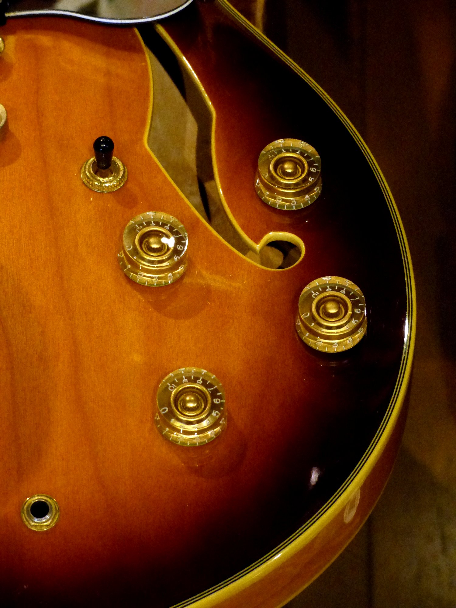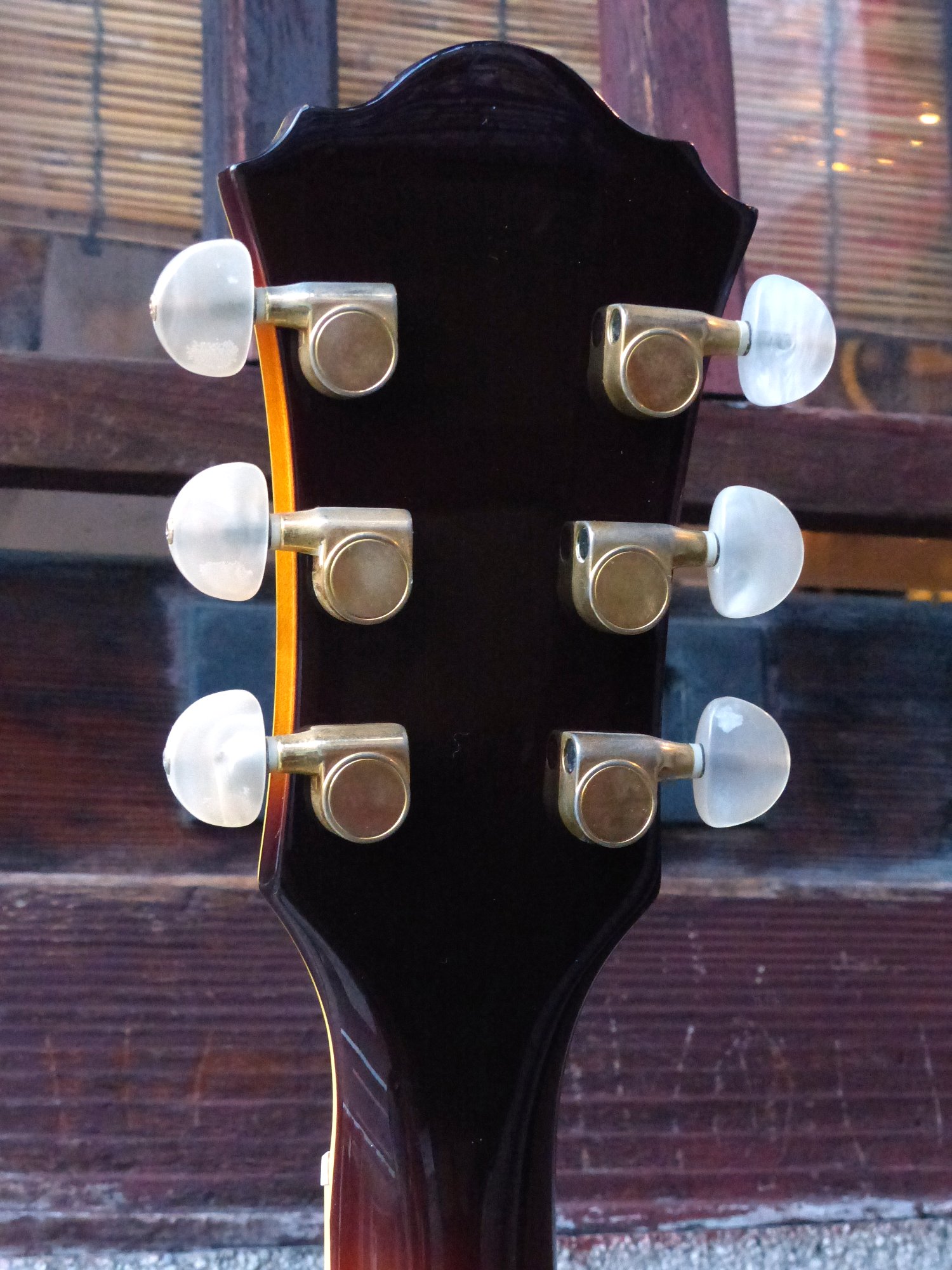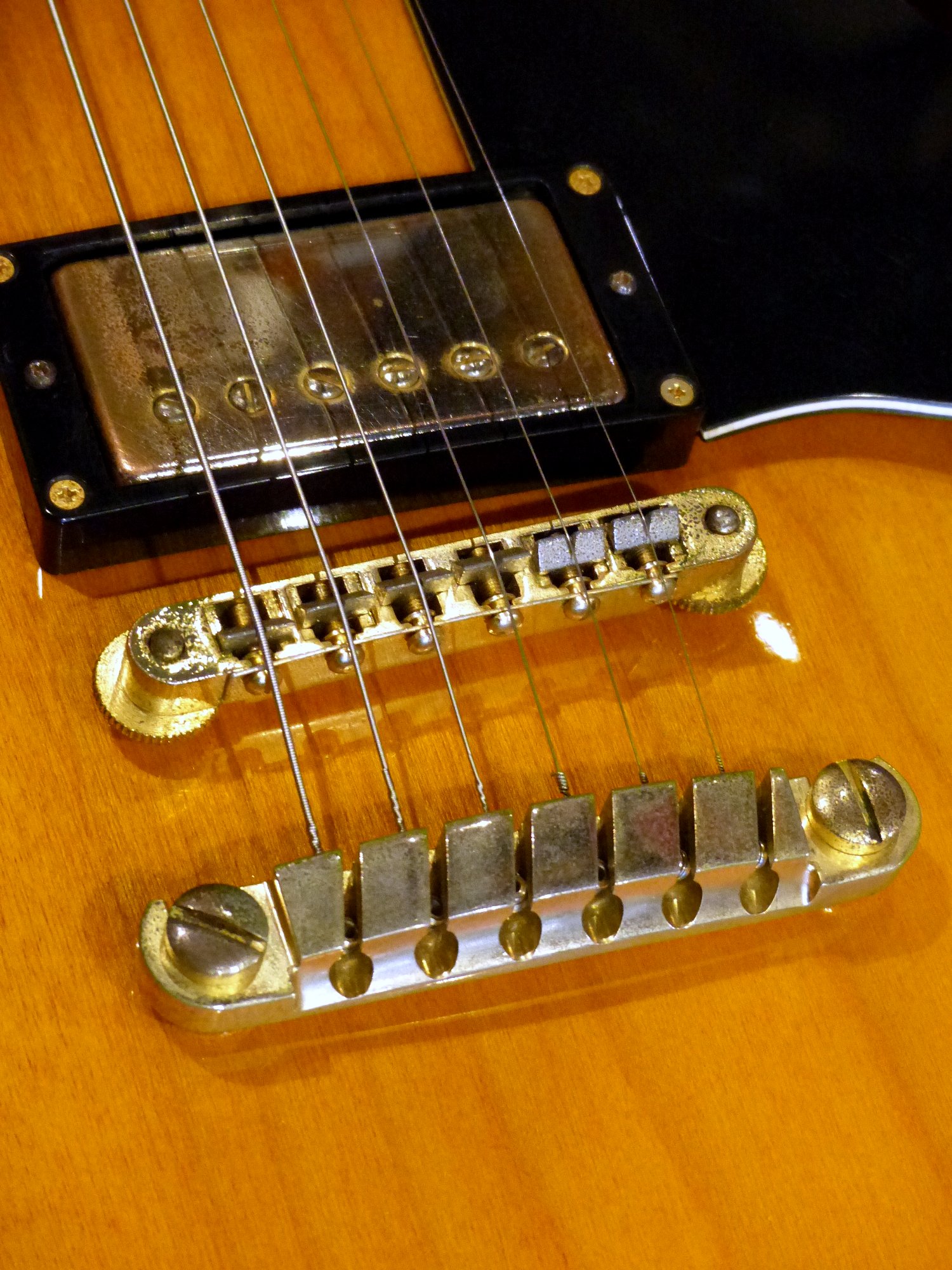 外観はピックアップ・カバーなど、ハードウェアのゴールドにくすみがありますが、目立つキズなども無く、全体的には大変きれいな状態に仕上がりました。