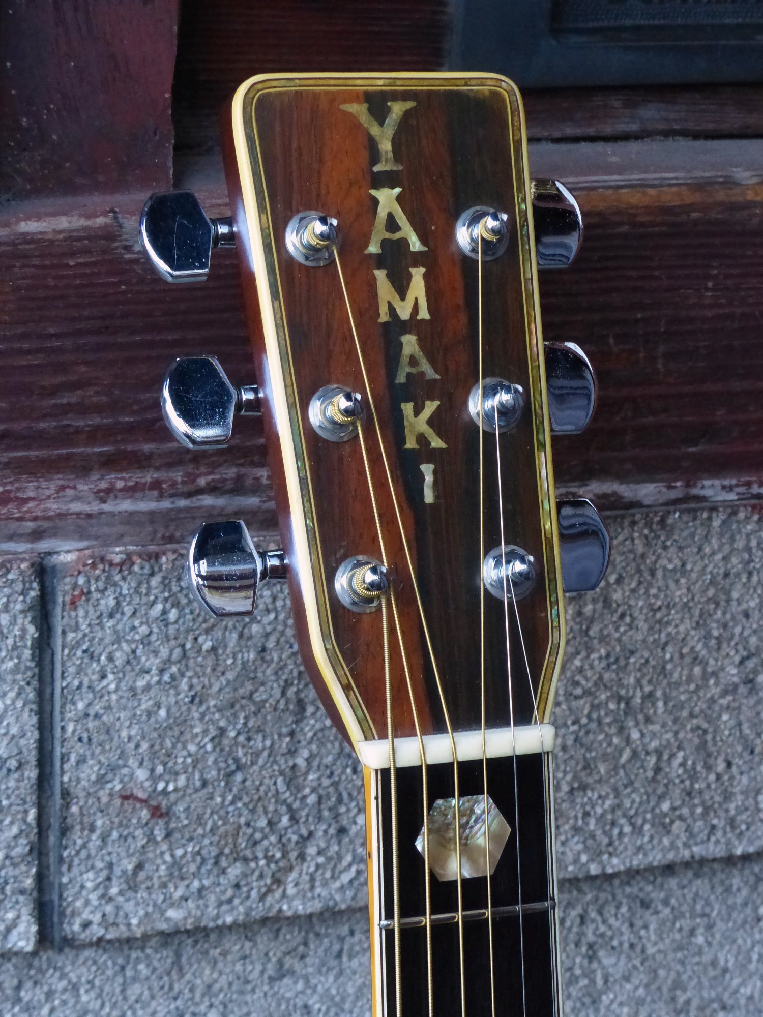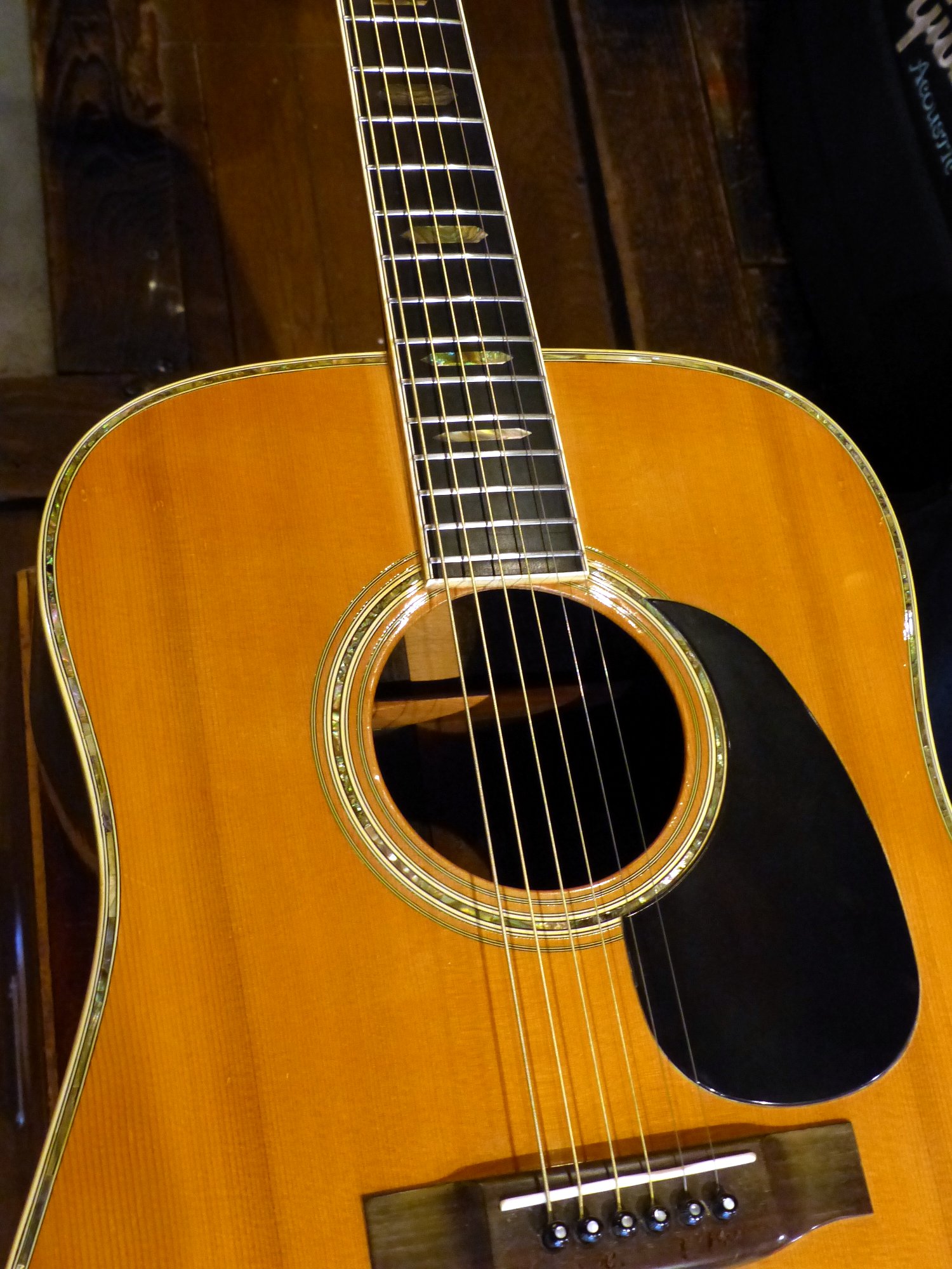 ボディー周囲、サウンドホールのロゼッタ周囲、ヘッド周囲までアバロン貝の装飾が施されています。